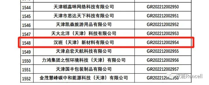 汉班(天津)新材料有限公司证书编号为:GR202212002954